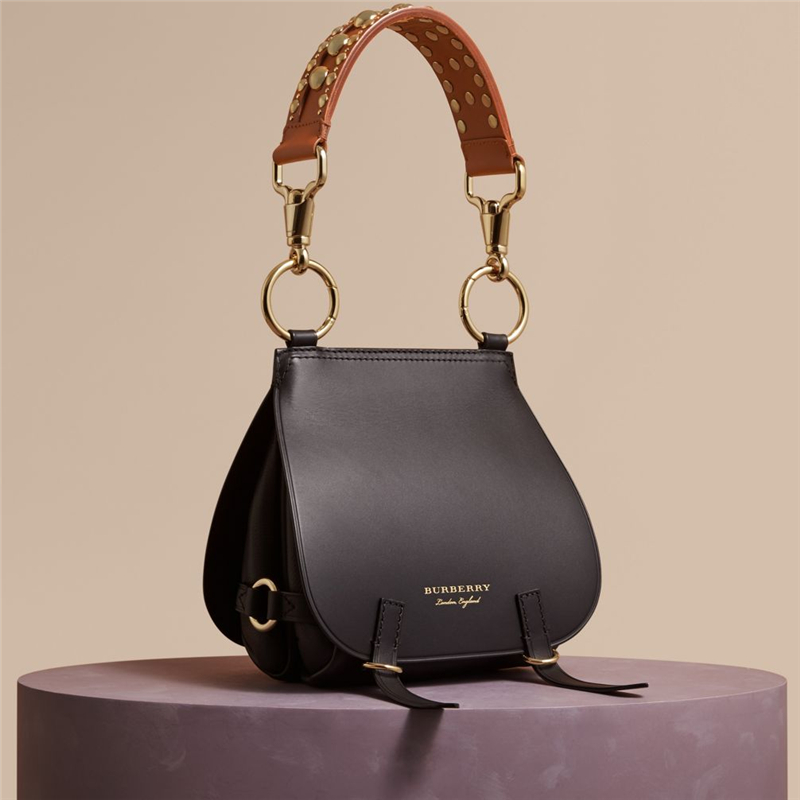 - 規(guī)格:40456481 巴寶莉 The Bridle 光滑皮拼粒紋皮 鉚釘鑲綴肩帶 馬勒包 黑色