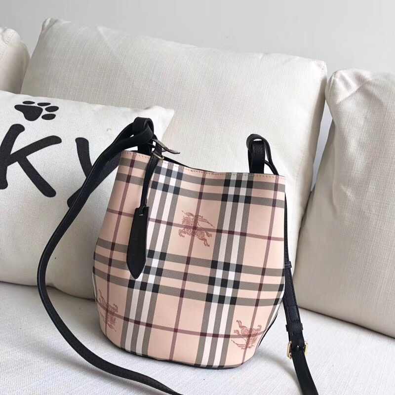 Burberry巴寶莉 Haymarket格紋 戰(zhàn)馬印花 拼色皮革 水桶包 黑色
