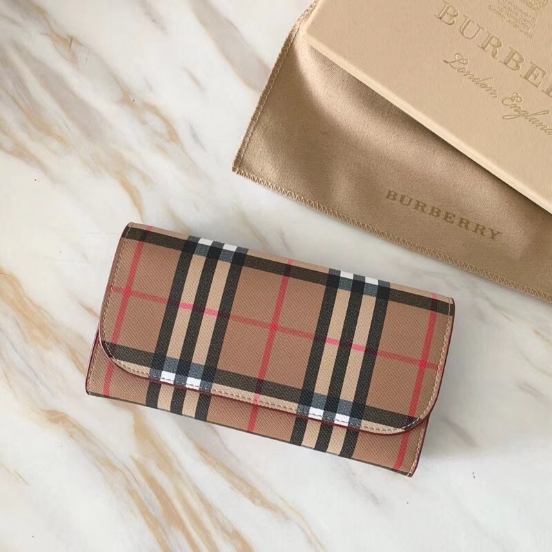 40734271 Burberry女款錢包 Vintage格紋拼皮革 撞色 巴寶莉長款錢夾 緋紅
