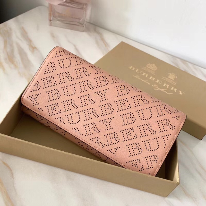 • Burberry巴寶莉 激光沖孔式紋案 皮革 翻蓋 兩折長款錢包 淺卡其
