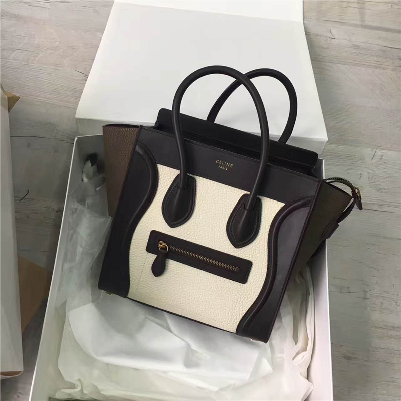 - 2017賽琳 celine笑臉包囧臉包 頭層牛皮 三色拼接 翅膀手提包 牛津白深啡綠棕