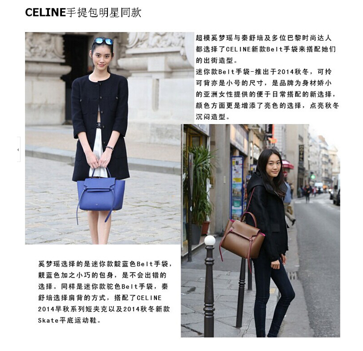 • 詳細(xì)介紹:早前的2015春夏巴黎時(shí)裝周期間,秦舒培、劉雯、奚夢瑤三位頂有名的超模都拎起了同一款手袋,它就是——Celine Belt Bag!作為2015早春最新款,拋光小牛皮、荔枝紋款依舊第一時(shí)間讓你選,這身價(jià)過萬的小物絕對(duì)是今冬最靚的一景,潮咖們速速入手搶先背起來~