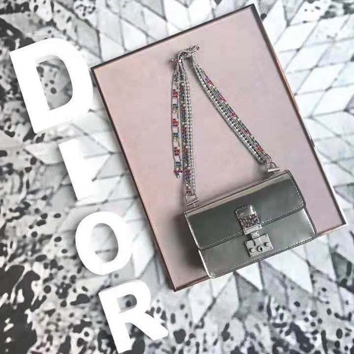 5817 Dior女包 復古彩鉆金屬扣 鏡面小牛皮 迪奧手袋 彩鉆鏈條肩包 銀灰色