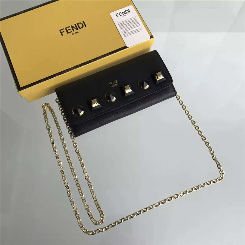 FENDI 芬迪 0251 2017新款南非小牛皮多功能長款鉚釘鏈條包斜跨包 黑色鉚釘