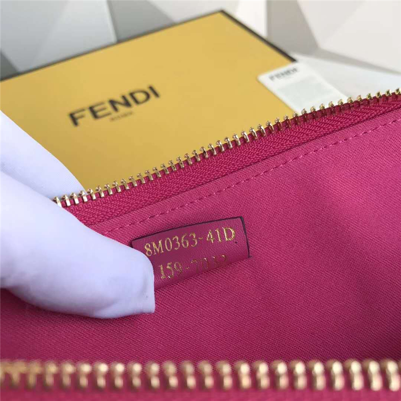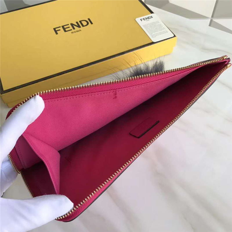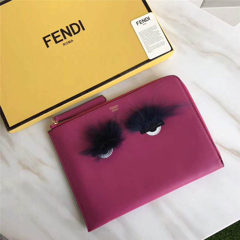 0363 FENDI 芬迪 柔軟小牛皮 毛絨眼睛 拉鏈手拿包 玫紅色
