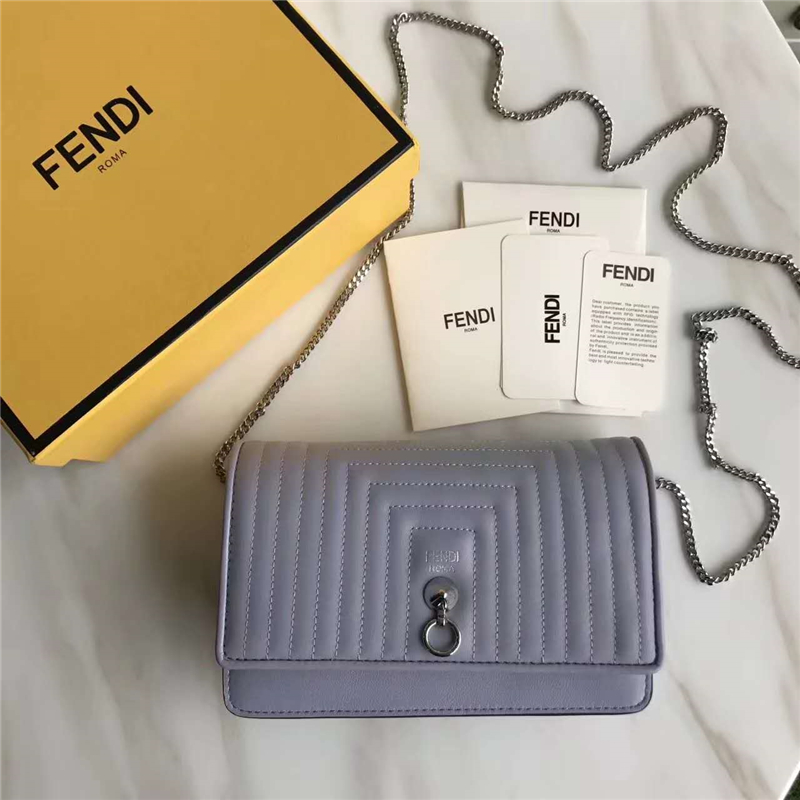 • FENDI 芬迪 6346 柔軟板巖軟羊鏈式皮夾 金屬環 可拆卸鏈條肩帶 淺灰色