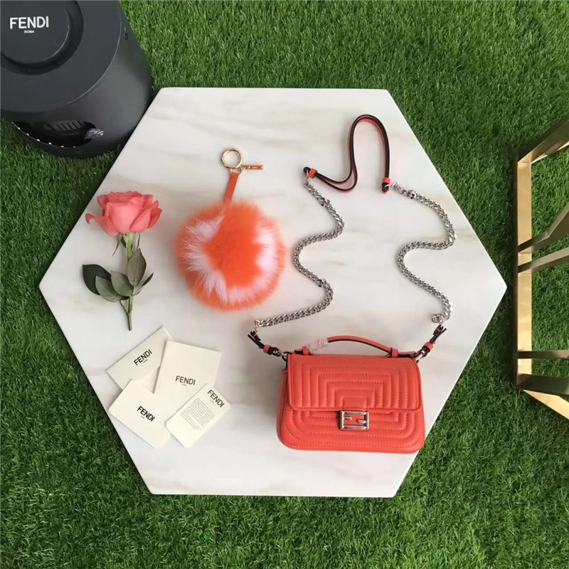 • FENDI 芬迪 8769 時裝秀款 Micro Baguette 壓紋雙面鏈條包 橘紅色