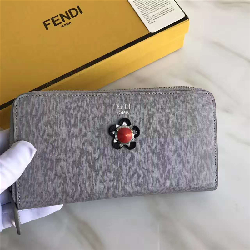 • FENDI 芬迪 小牛皮CRAYONS 2017新款 裝飾雙色皮革花朵長款錢包 灰色
