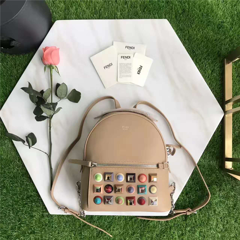 • FENDI 芬迪2017新品 進(jìn)口小牛皮 彩色鉚釘包 雙肩包 杏色