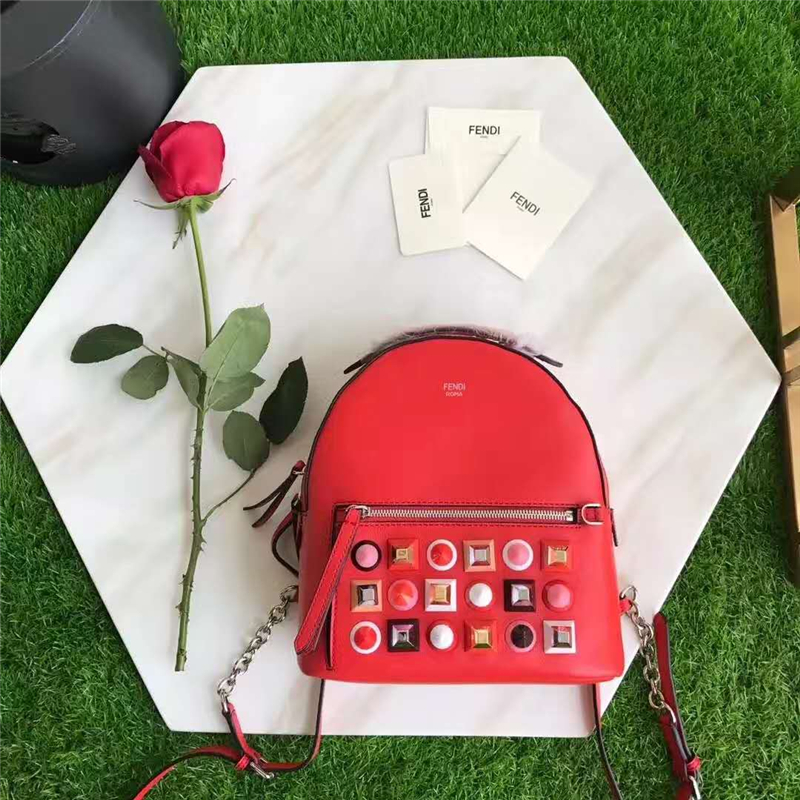 FENDI 芬迪2017新品 小牛皮 彩色鉚釘包 雙肩包 紅色