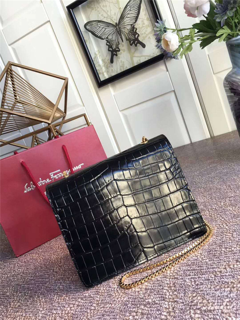 >Ferragamo|菲拉格慕>Ferragamo女包> 21F893 Ferragamo 菲拉格慕 半環(huán)搭扣 鱷魚紋 中號(hào)翻蓋 鏈條包 黑色商品描述