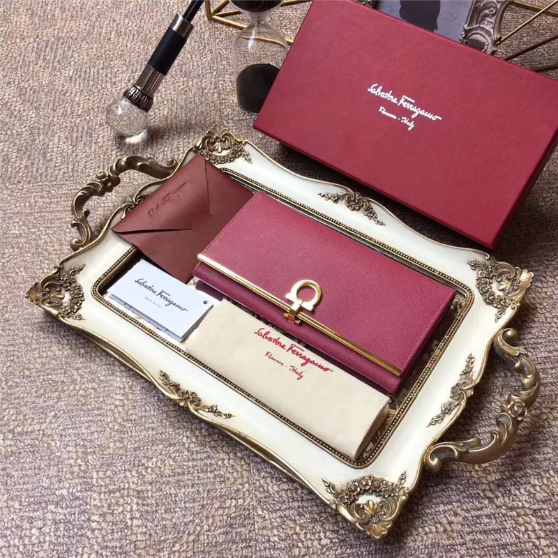 224633 Ferragamo菲拉格慕 大號 馬蹄搭扣 翻蓋法式錢包 桃紅色