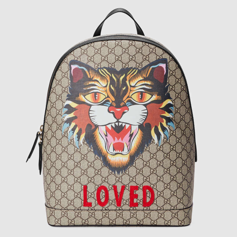 419584 GUCCI 氣場貓印花 GG Supreme高級人造帆布 雙肩包