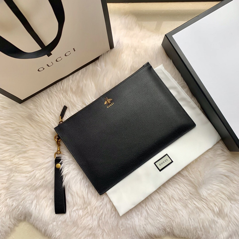 475317 Gucci GG Marmont系列皮革手拿包 蜜蜂金屬配件手包 黑色