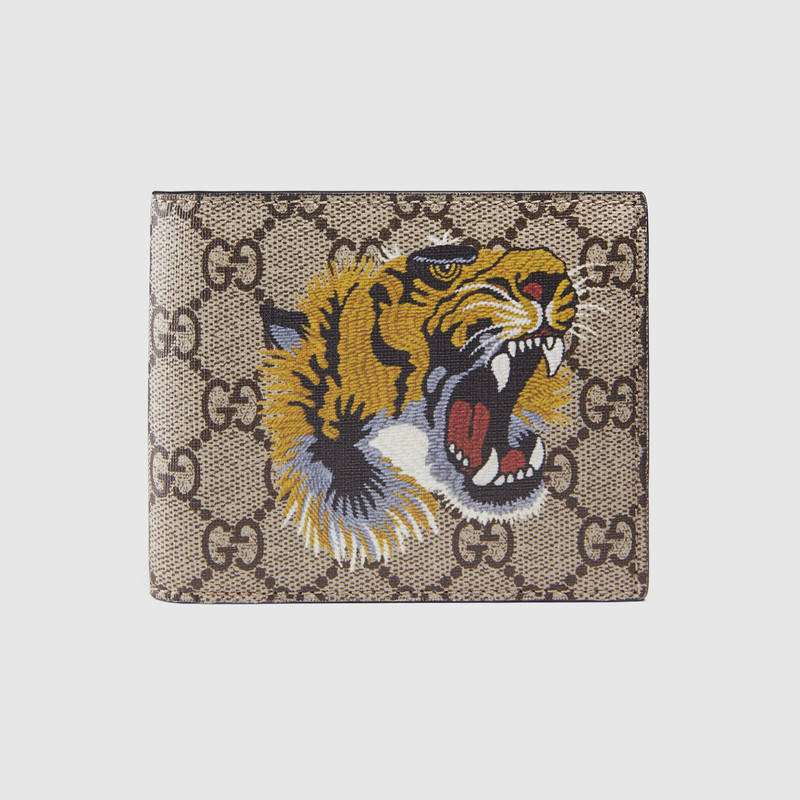 • 詳細介紹:老虎已迅速成為Alessandro Michele的標志性細節之一。此款雙折皮夾采用GG Supreme高級人造帆布精制而成,材料可分解,中央裝飾印花。米色/烏木色GG Supreme高級人造帆布,配以老虎印花,黑色真皮滾邊,12個卡片隔層和2個鈔票隔層