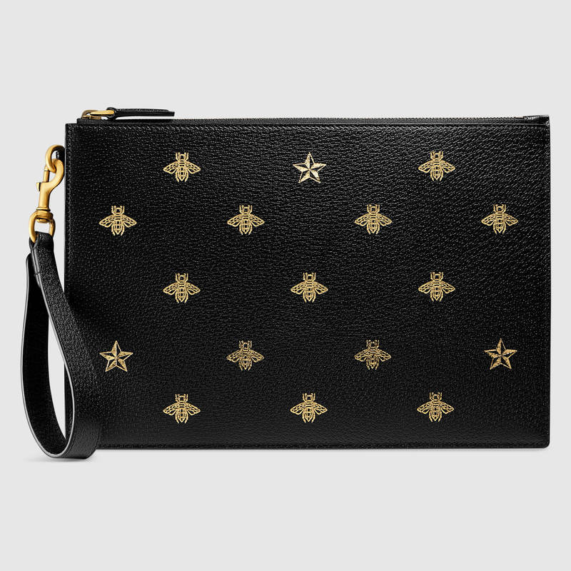 • 詳細介紹:Gucci蜜蜂——源自70年代典藏設計的歷史性標志——搭配精美的星星圖案。印花以金屬質感金色精美印制在纖薄手拿包的黑色皮革上。