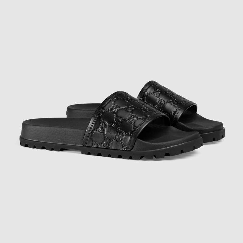 • 431070 熱壓Gucci Signature真皮 厚帶休閑涼鞋 印花拖鞋 黑色
