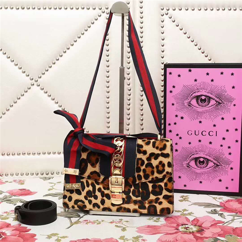 • 421882 GUCCI Sylvie新款 豹紋 蝴蝶結(jié)織帶 單肩女包 啡色