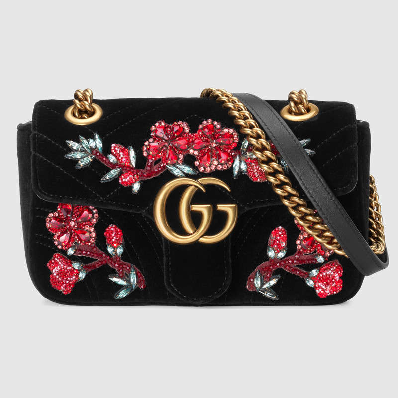 當(dāng)前位置: 首頁>Gucci|古奇>Gucci女包> 446744 GUCCI GG Marmont系列 刺繡 人形花紋天鵝絨 迷你手袋 黑色