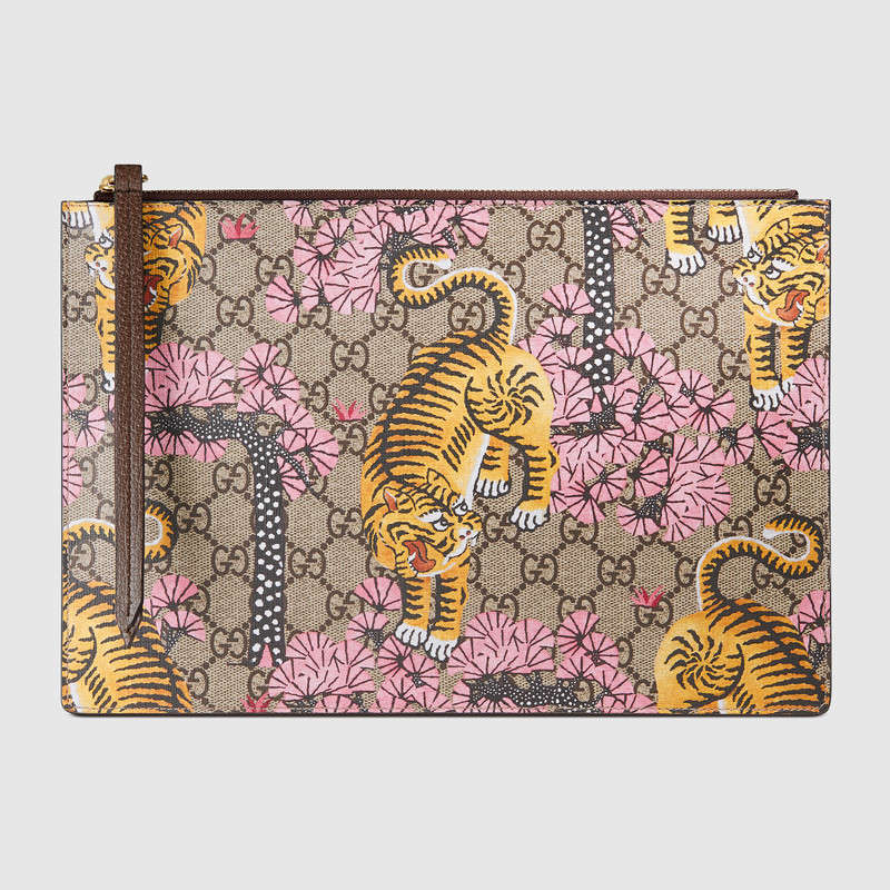 • 詳細介紹:手拿包采用GG高級人造革精制而成,配以Gucci孟加拉虎印花,在2017早春系列中引入。印花描繪了一幅猛虎在多彩的山林中穿行的場景,通過輕快的筆觸精心勾勒,在GG圖案上打造立體效果。