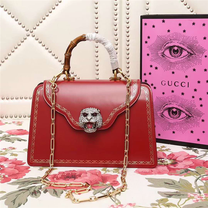 - 495881 Gucci女包 古馳手提包 虎頭鑲鉆 竹節(jié)提手 Gucci翻蓋鏈條包 紅色