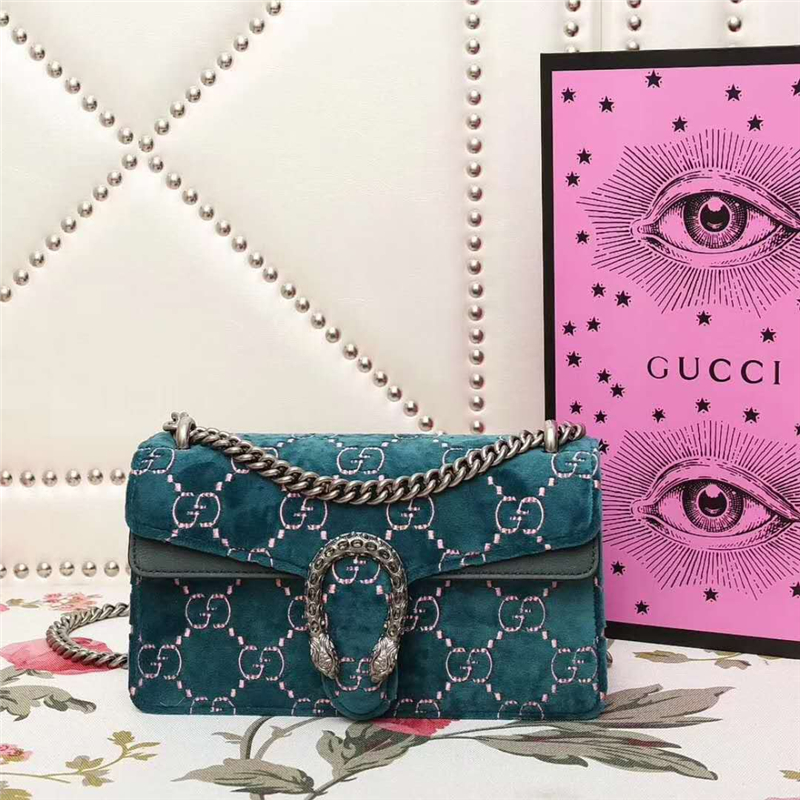 • 499623 Dionysus系列 GG天鵝絨 織紋虎頭扣 鏈條肩包 藍綠色