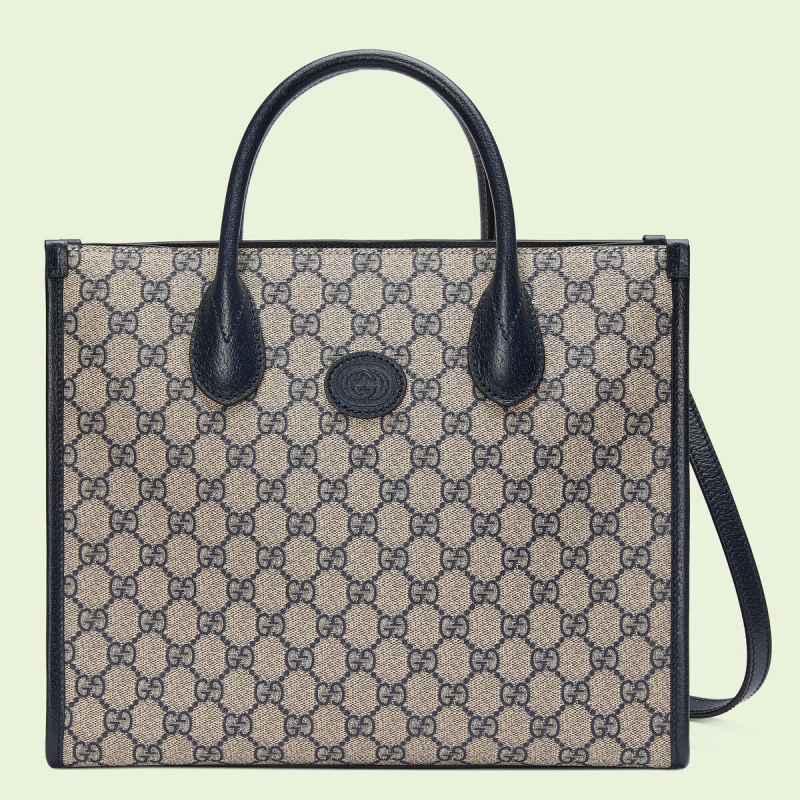 • 結構:米色和藍色GG Supreme帆布,環保材料 藍色皮革滾邊 飾互扣式雙G皮革標簽 棉麻襯里 內部:1個拉鏈口袋 提手(8厘米高) 肩帶(40厘米高) 鉤扣