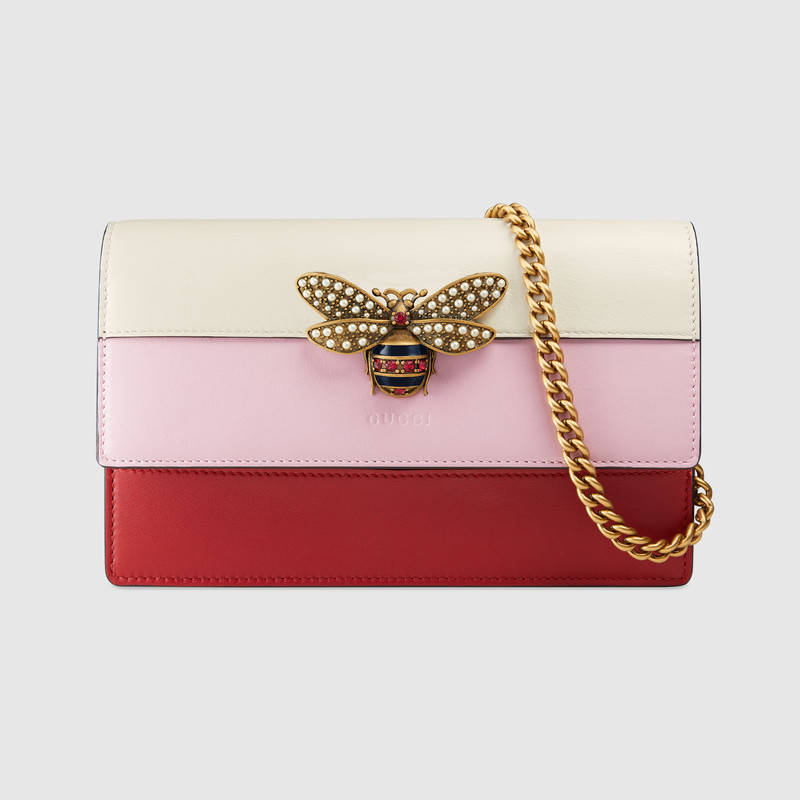 • 詳細介紹:Queen Margaret 系列系列與經典Gucci細節精彩搭配,裝飾新近確立的精美標志。象征智慧和愛的蜜蜂裝飾玻璃珠和彩色水晶。采用光滑皮革精心打造,色塊設計微微閃亮。