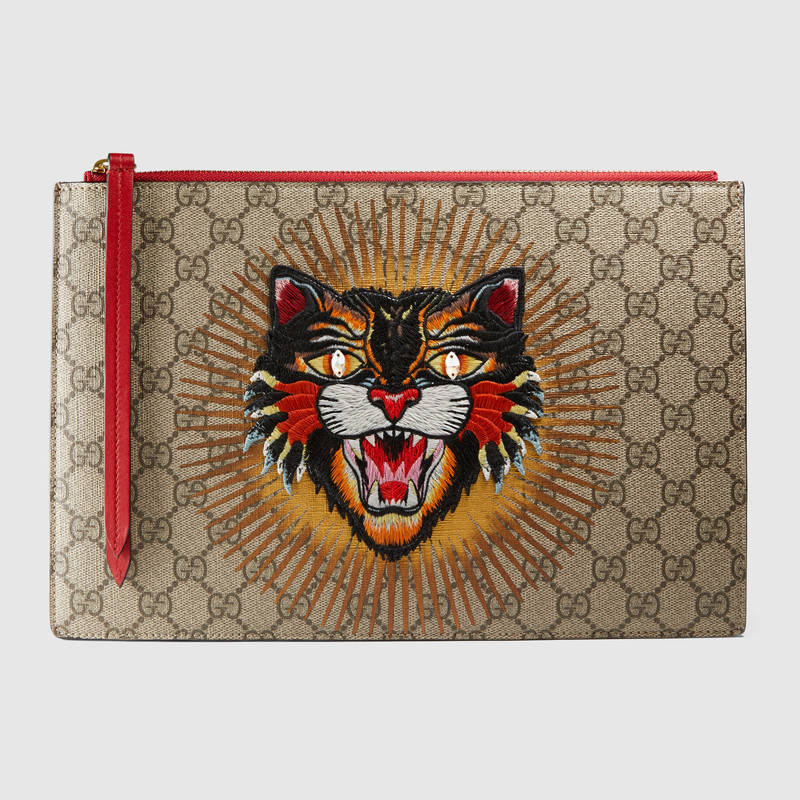 • 詳細介紹:GG圖案在每一季中均與全新印花和圖案精心搭配。Gucci在早秋系列中引入氣場貓圖案,貫穿男女系列。手拿包采用GG Supreme高級人造帆布精心打造,可分解材料,中央裝飾精美圖案,獨特印制打造三維立體效果。