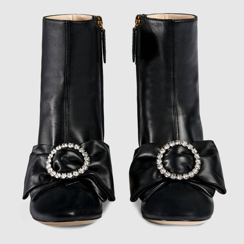 • 481171 GUCCI 可拆卸 珠寶蝴蝶結 皮革 及踝靴 高跟鞋 黑色