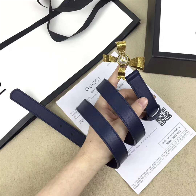 • 2008114899 Gucci 2017年新款 牛皮 金屬蝴蝶結飾釘 雙G帶扣 女式皮帶 藍色