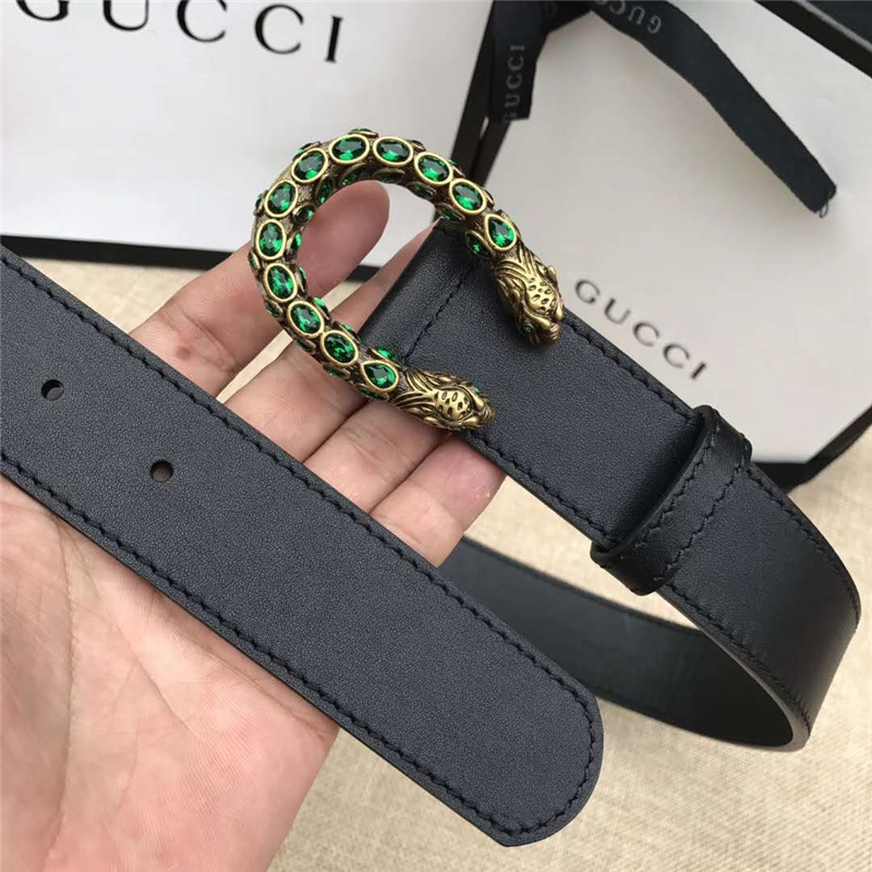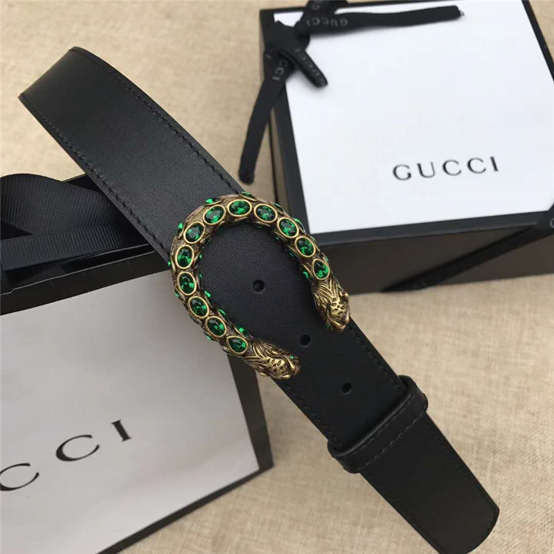 • GUCCI 古馳 2017暢銷女款 雙面進(jìn)口平紋 頭層牛皮 龍頭花紋扣 黑帶綠鉆金扣