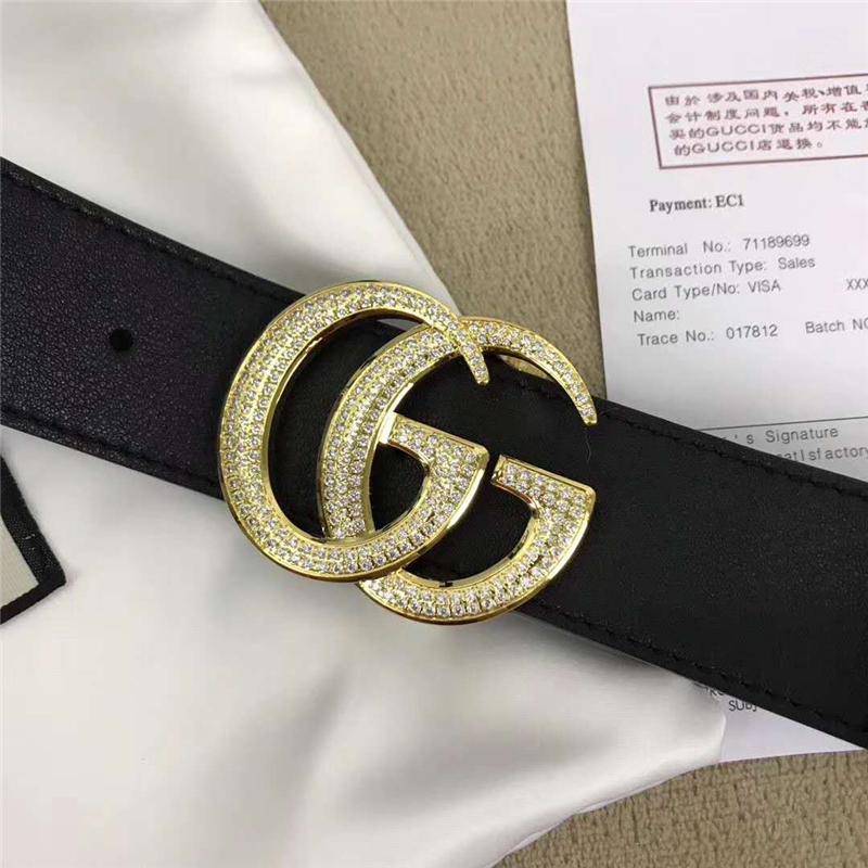 4208114879 Gucci 2017新款 牛皮 互扣式滿鉆GG帶扣 Gucci腰帶 男款皮帶 金色