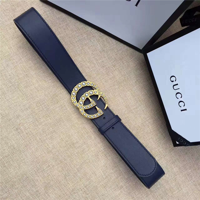 • Gucci 原版牛皮搭配原單仿古銅珍珠雙G扣頭 腰帶 彰顯超凡品味 頂級(jí)精品 藍(lán)色