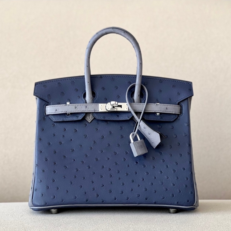 愛馬仕Hermes Birkin25 愛馬仕鉑金包 純手工定制版 鴕鳥皮 藍色瑪瑙灰拼色