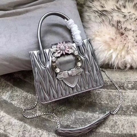 5BA081 專柜新款 MIU LADY 小羊皮 仿水晶大鉆裝飾 手提肩包 銀色