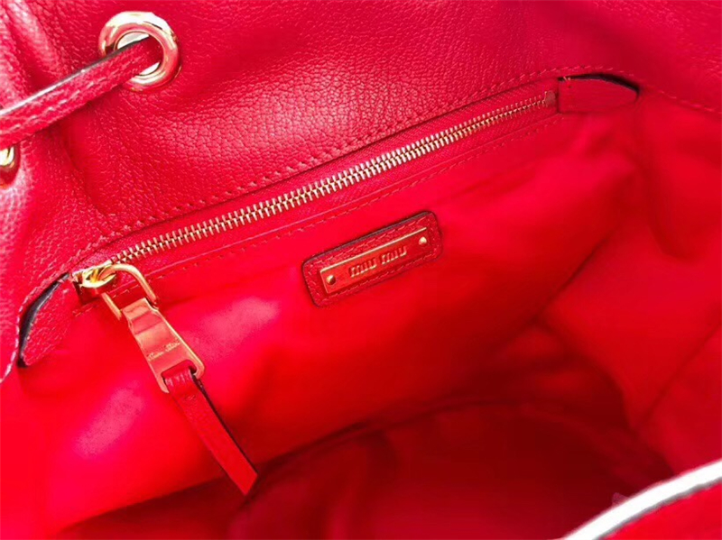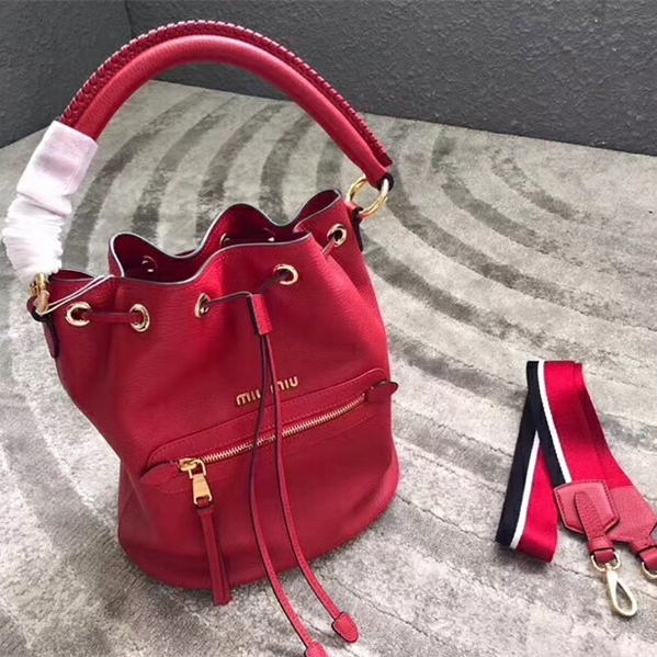 5BE027 MIUMIU繆繆 新款 山羊皮 編織皮革肩帶 抽繩水桶包 紅色
