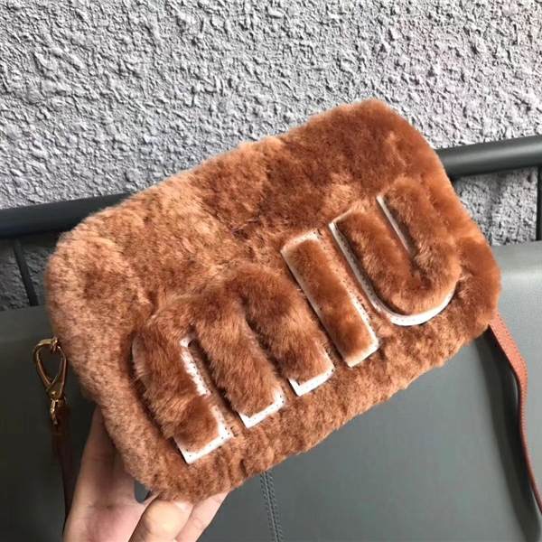 5BH084 MIUMIU繆繆 Big logo 羊羔毛 雙拉鏈 手包斜挎包 棕色