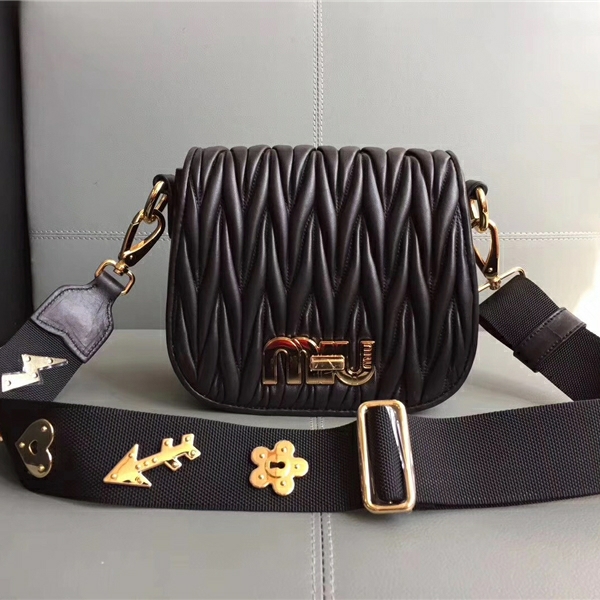 5BH085 MIUMIU繆繆 專柜新品 小羊皮 轉鎖開合 徽章肩帶斜挎包 黑色