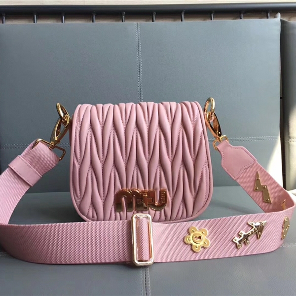 5BH085 MIUMIU繆繆 專柜新品 小羊皮 轉鎖開合 徽章肩帶斜挎包 粉色