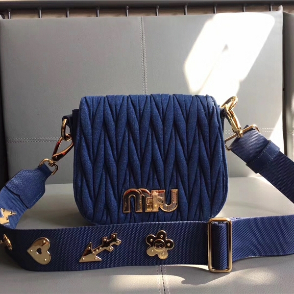 5BH085 MIUMIU繆繆 專柜新品 牛仔布 轉鎖開合 徽章肩帶斜挎包 藍色