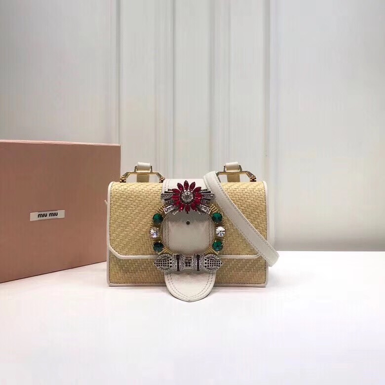 5BH609 MIUMIU專柜新款 仿水晶帶扣 草編皮革 翻蓋手袋 白色