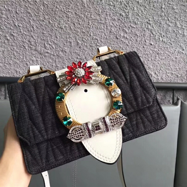 5BH609 MIUMIU專柜新款 牛仔布 寶石釘大鉆扣 翻蓋斜挎包 黑灰拼白