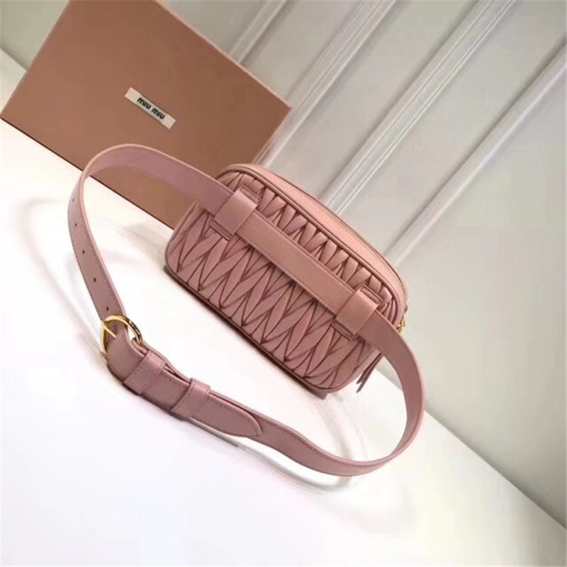 5BL018 MIUMIU繆繆 軟羊皮 經(jīng)典褶皺 拉鏈 皮腰包 粉色