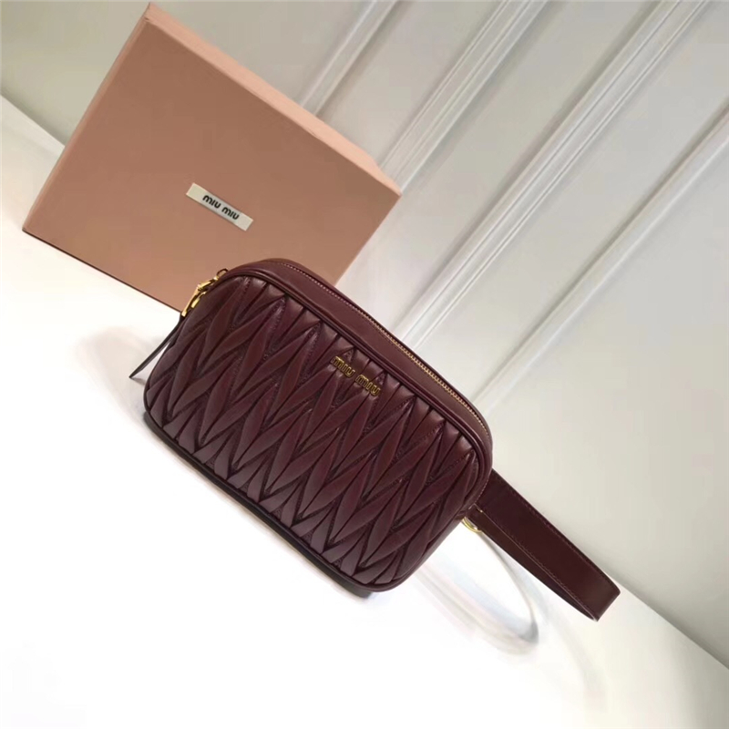 5BL018 MIUMIU繆繆 軟羊皮 經(jīng)典褶皺 拉鏈 皮腰包 棗紅色
