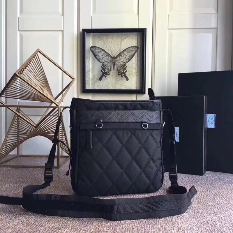2VH002 Prada普拉達 繡格仔 降落傘布拼十字紋牛皮 男士郵差包 黑色