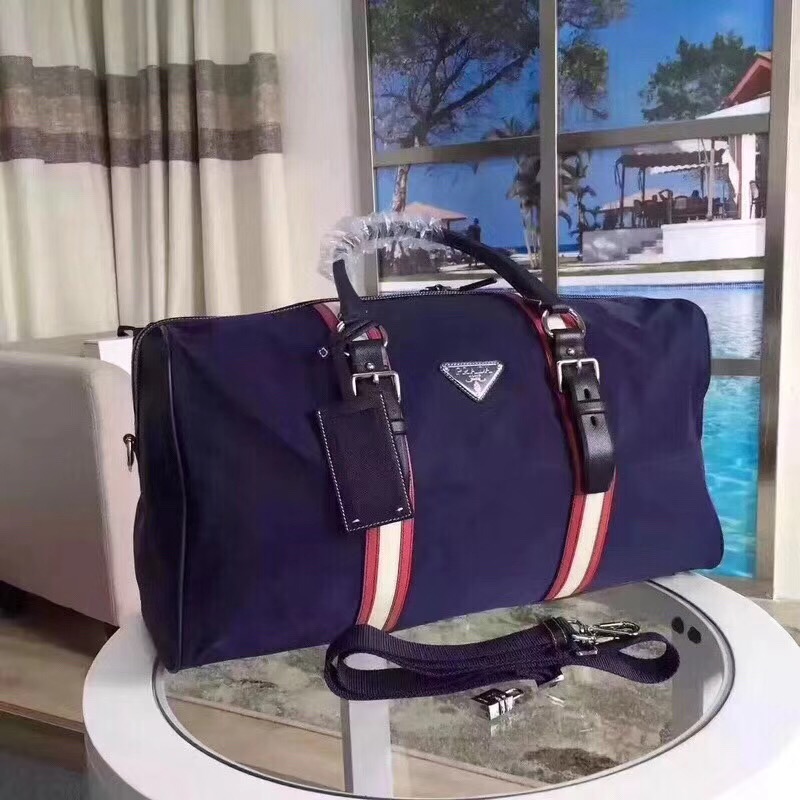 • VS0330S Prada旅行包 防水料 雙皮革提手 男女通用 休閑挎包 藍色