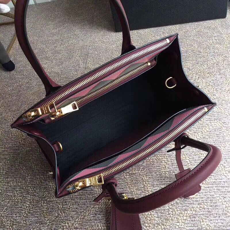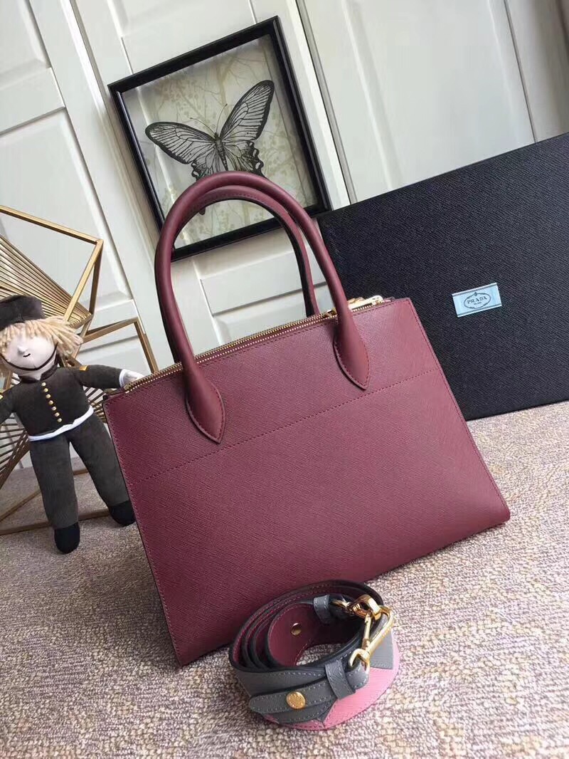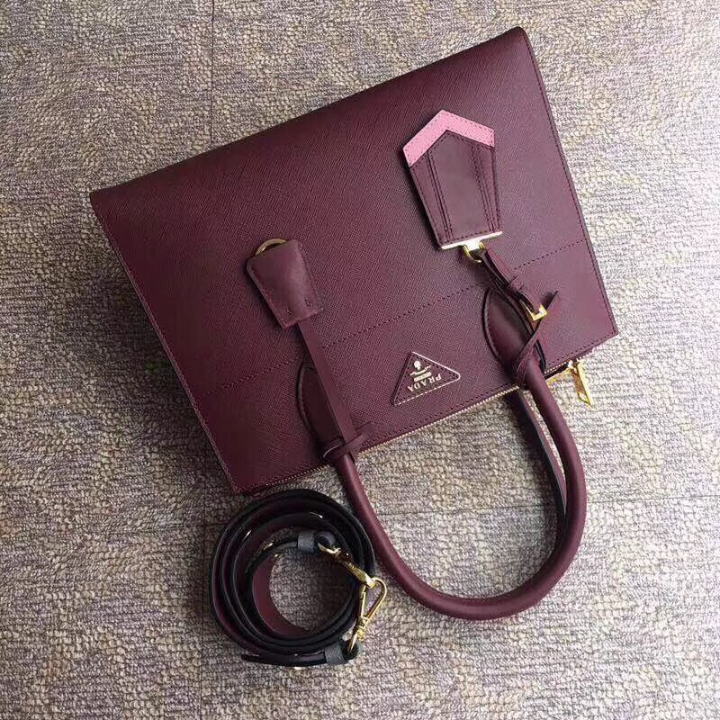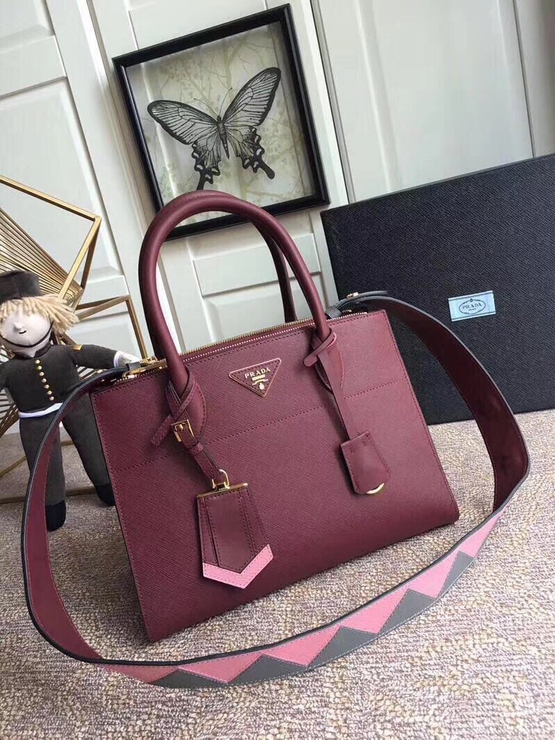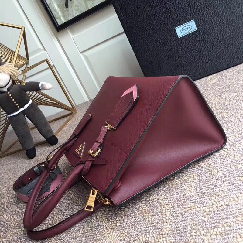 1BA102 Prada普拉達 最新款 拼色牛皮 女士手提袋 棗紅