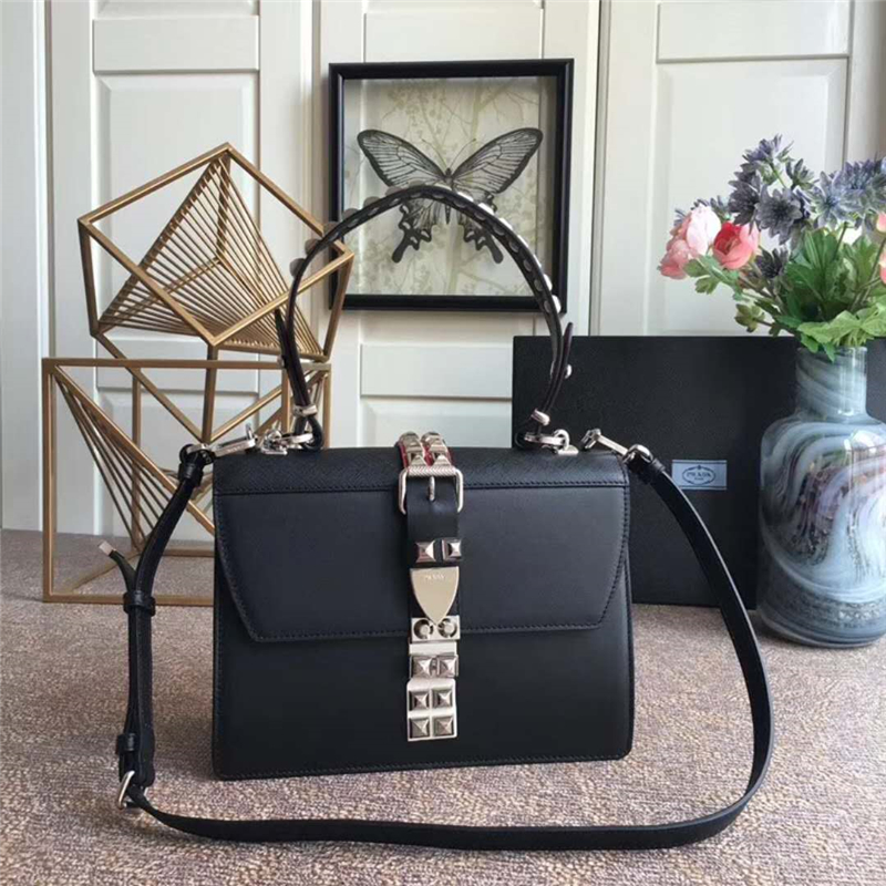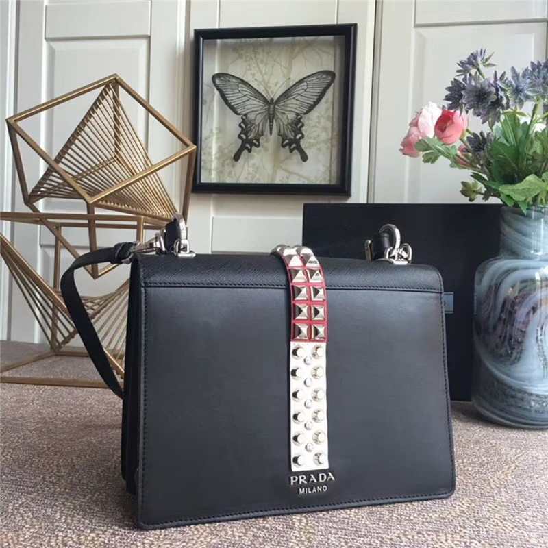 • 1BA179 Prada女包 普拉達休閑包小牛皮 鉚釘皮革手柄 黑色