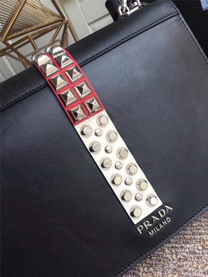 1BA179 Prada女包 普拉達休閑包小牛皮 鉚釘皮革手柄 黑色